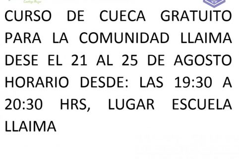CURSO DE CUECA GRATUITO PARA LA COMUNIDAD LLAIMA DESE EL 21 AL 25 DE AGOSTO HORARIO DESDE: LAS 19:30 A 20:30 HRS, LUGAR ESCUELA LLAIMA