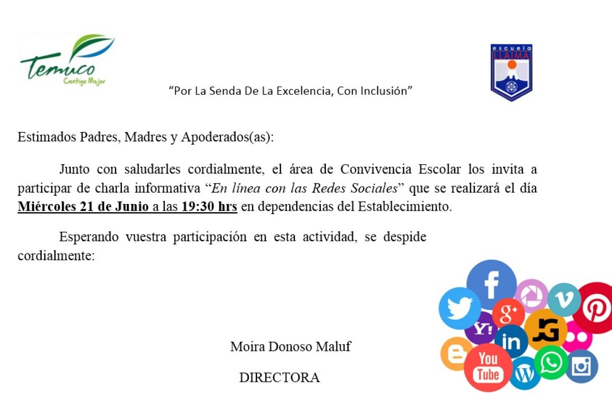 Junto con saludarles cordialmente, el área de Convivencia Escolar los invita a participar de charla informativa “En línea con las Redes Sociales” que se realizará el día Miércoles 21 de Junio a las 19:30 hrs en dependencias del Establecimiento.