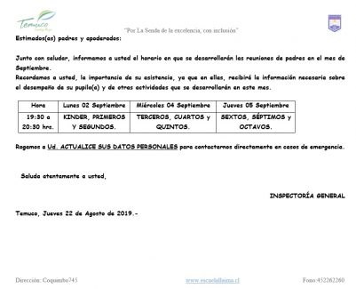 Junto con saludar, informamos a usted el horario en que se desarrollarán las reuniones de padres en el mes de Septiembre.