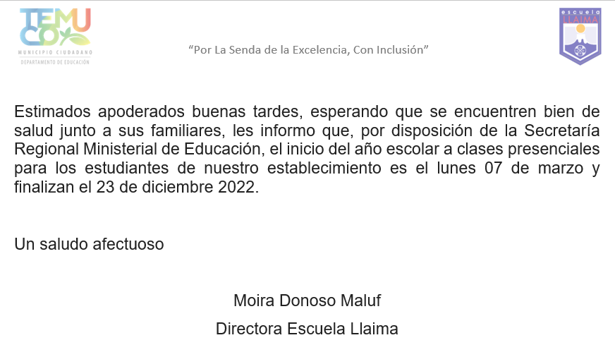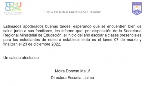 Estimados apoderados buenas tardes, esperando que se encuentren bien de salud junto a sus familiares, les informo que, por disposición de la Secretaría Regional Ministerial de Educación, el inicio del año escolar a clases presenciales para los estudiantes de nuestro establecimiento es el lunes 07 de marzo y finalizan el 23 de diciembre 2022.