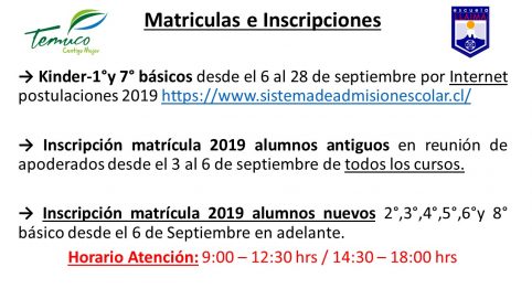 Inscripción matrícula 2019 alumnos nuevos 2°,3°,4°,5°,6°y 8° básico desde el 6 de Septiembre en adelante.