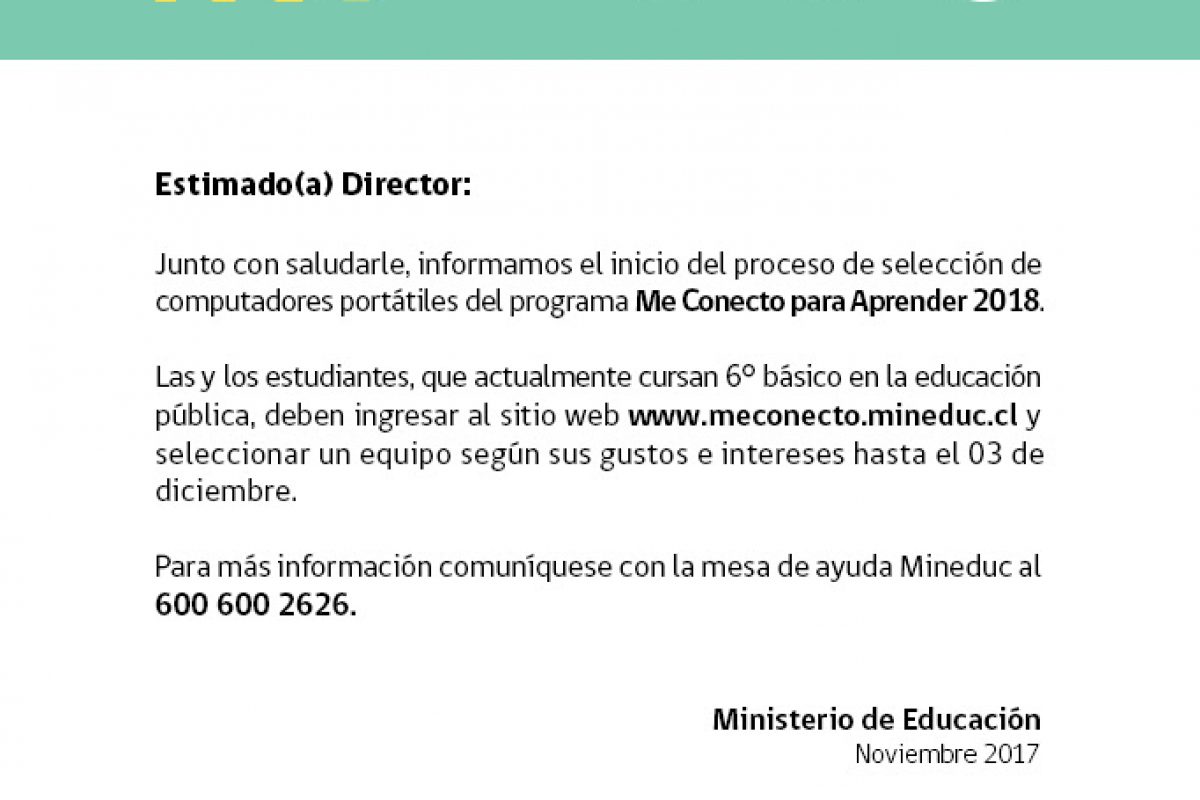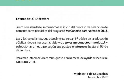 En consecuencia los estudiantes que cursan sexto año deben elegir su pc envió link http://meconecto.mineduc.cl/ y se adjunta folleto, se envió información por MySchool
