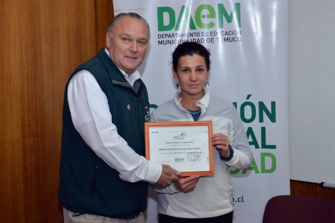 El día Lunes 11 de Abril, los profesores destacados de la comuna de Temuco en el proceso de Evaluación Docente 2015, recibieron de parte del Sr. Alcalde, un reconocimiento por sus resultados. Felicitamos a nuestra colega Sra. María Soledad García Navarrete por su logro profesional.