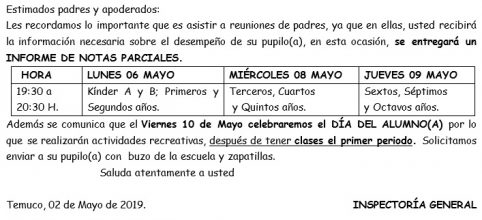 Les recordamos lo importante que es asistir a reuniones de padres, ya que en ellas, usted recibirá la información necesaria sobre el desempeño de su pupilo(a), en esta ocasión, se entregará un INFORME DE NOTAS PARCIALES.